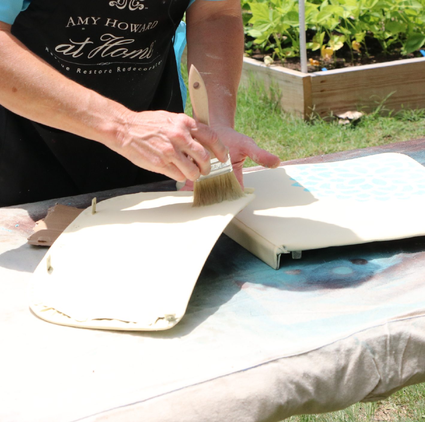Start with the vinyl cushions. Mix up Amy Howard’s Chalk Based Paint, pour a small amount into a bowl then a small amount of water for about 20 percent of your volume. The water will help thin the paint to prevent it from cracking in the future.