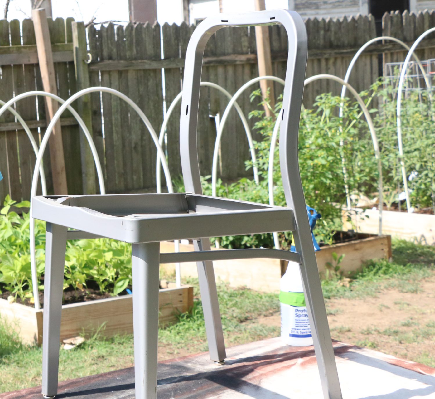 Shake your spray lacquer then start at the top of the chair and work your way down with long clean strokes. Do as many coats as it needs to have even coverage, sand lightly between each layer and wipe with a damp cloth. Then finish it off with a coat of clear lacquer.