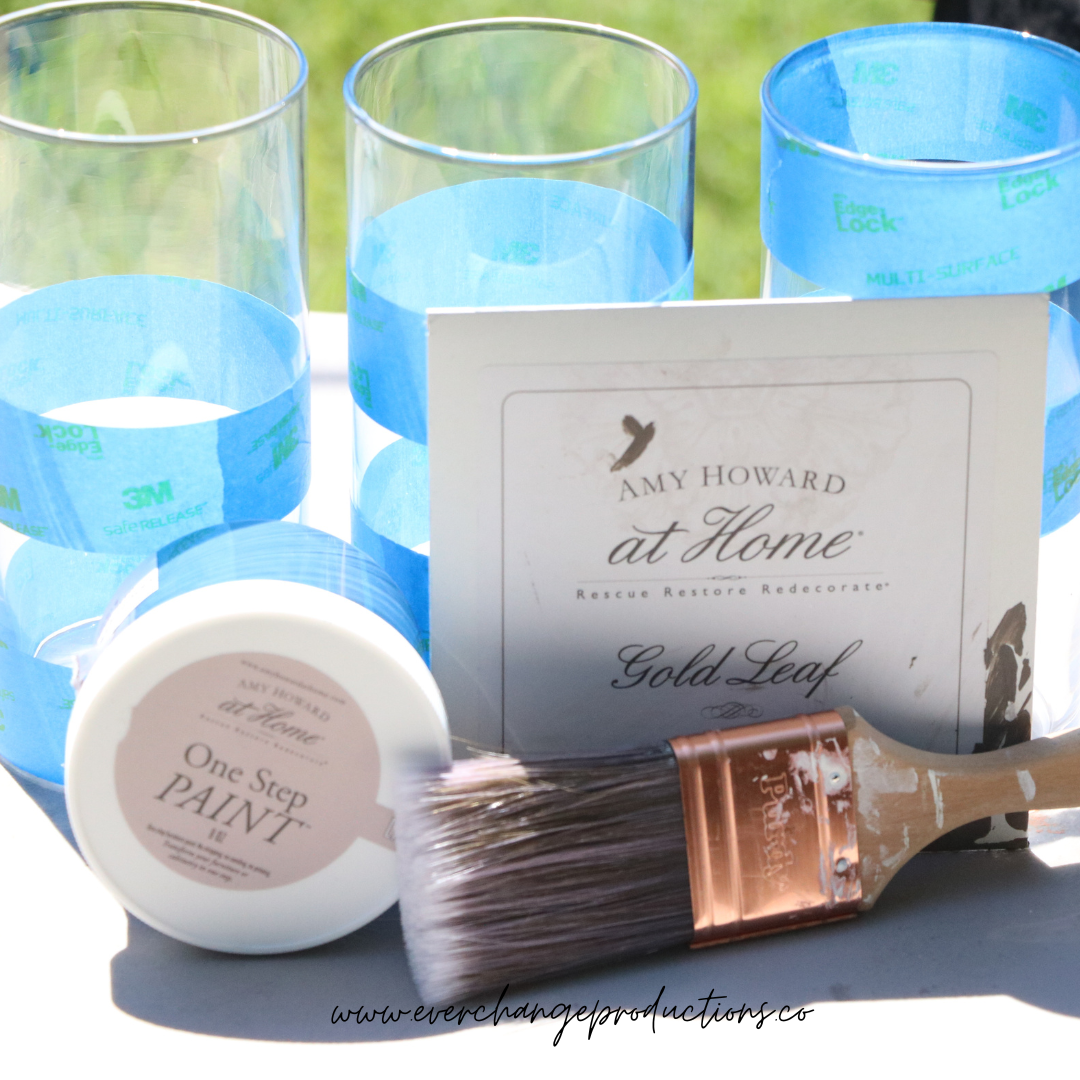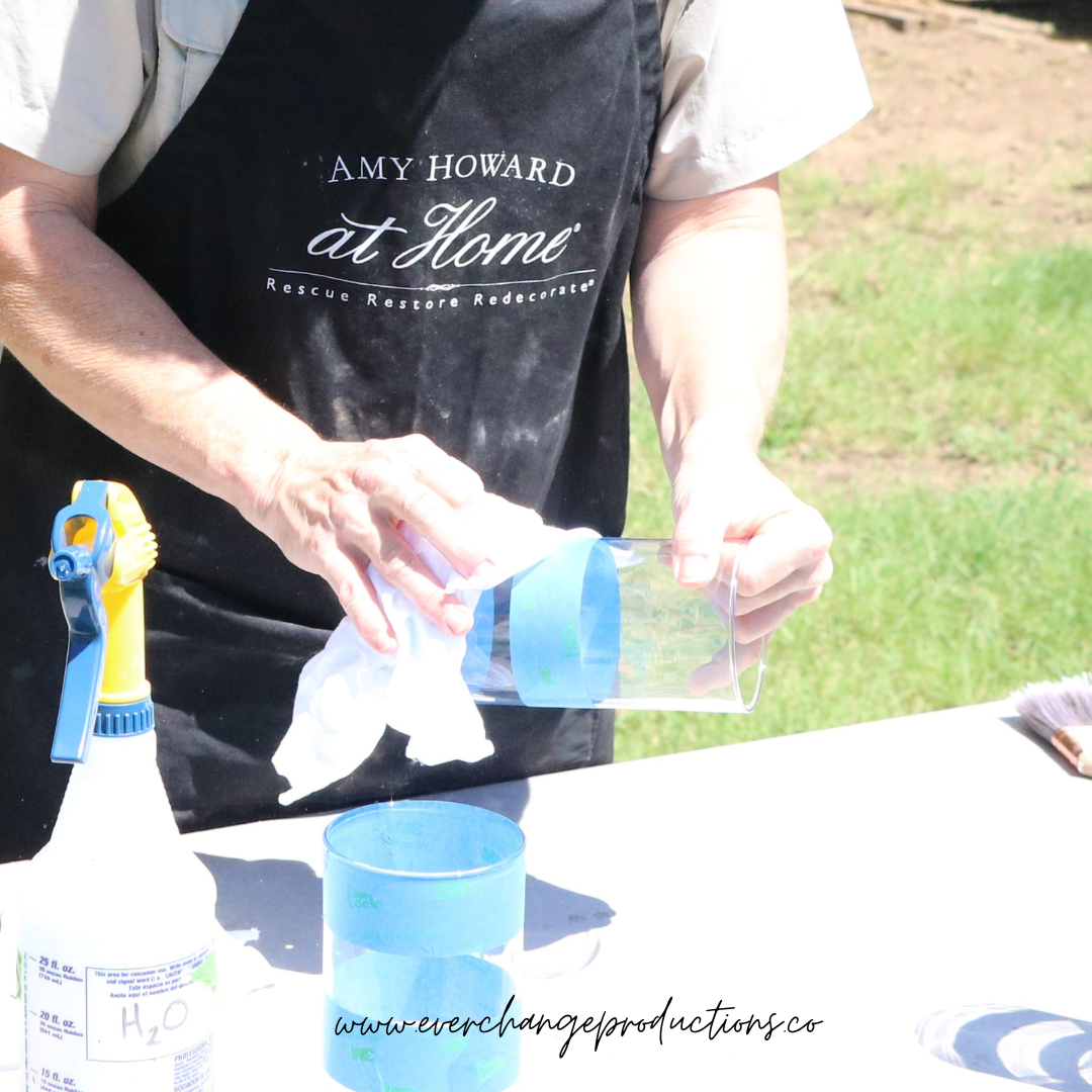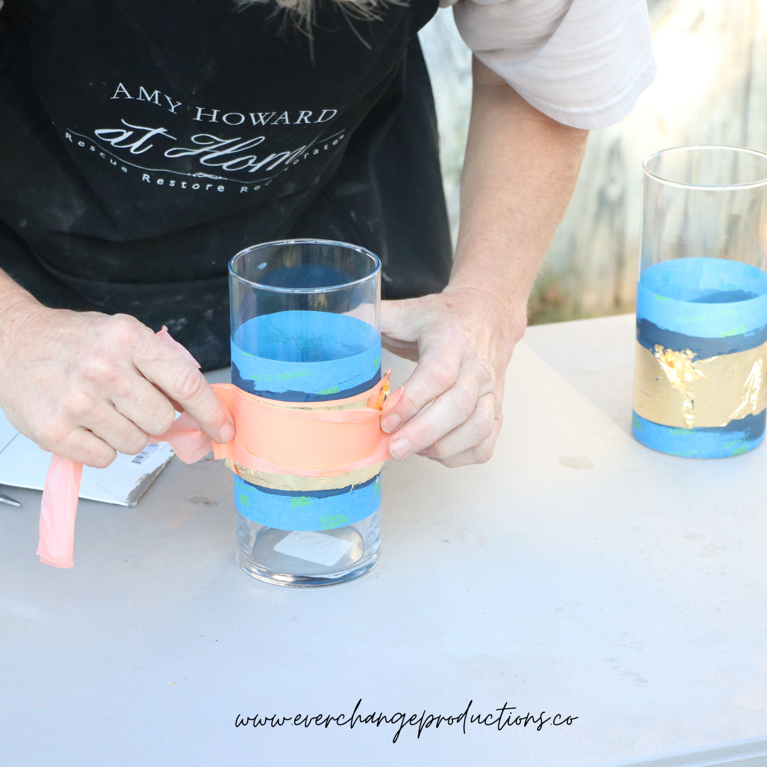 Using the painters tape, tape whatever kind of design you would like on to the glass. We went with a simple stripe at varying levels.